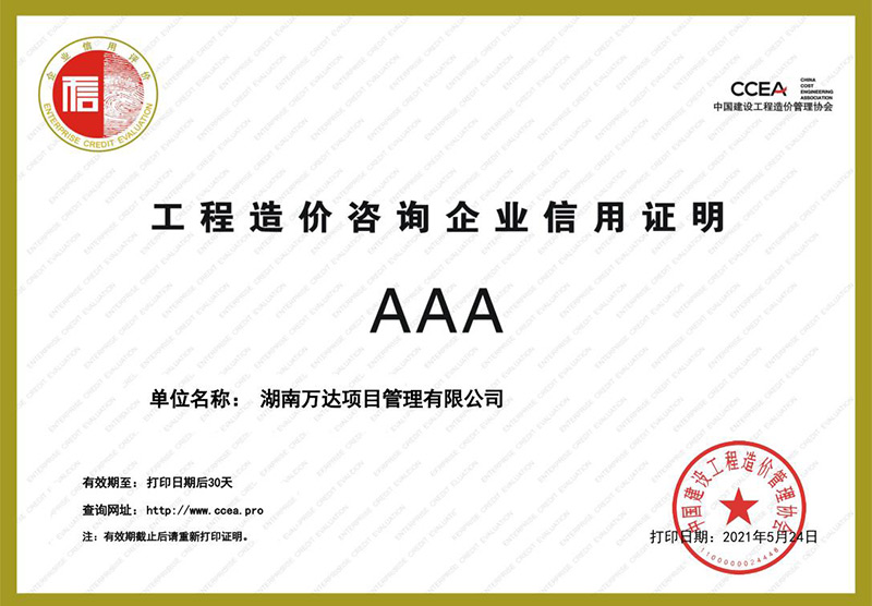 中国建设工程造价协会信用评价AAA荣誉